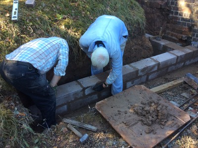 Drainage pipe in pea gravel behind blocks and brick fascia started in front
